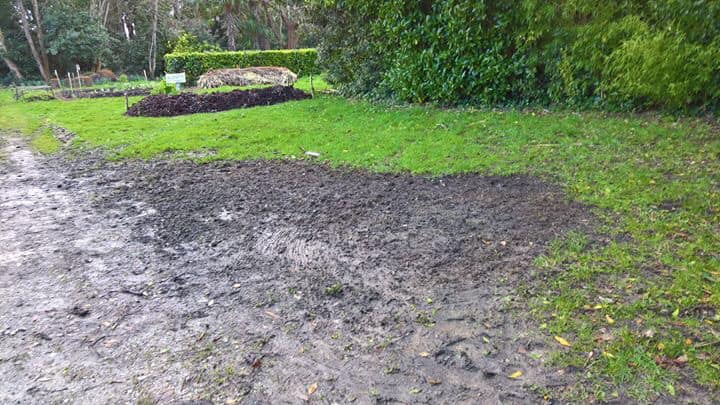 Gérard, Patrick et Thomas, ont fait de belles allées entre les planches de culture du jardin « petites mains vertes » et recouvert une allée entre planches longeant la haie.