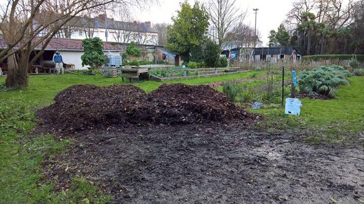 Denis et Étienne ont transporté une partie de notre tas de feuilles. Étienne a créé un tas. Objectifs : Réoxygéner pour éviter putréfaction, et créer un stock de mulch pour le futur. Enlever les morceaux de plastique et autres déchets aussi.